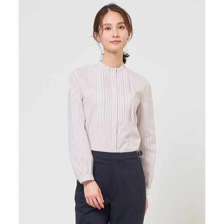 ■素材縦糸にトルコ原産のコットンを、横糸にはナイロンとポリウレタンの糸を使って、密度濃くコンパクトに織り上げた素材を使用。薄すぎず、厚すぎない絶妙なバランスの生地感で、程よいペーパータッチのようなハリと、ドライ感があるのが特徴です。さらに、伸縮性(キックバック)を兼ね備えているため、窮屈感なく快適に着られます。柄は、トラディショナルな定番ストライプを採用。色合いは落ち着いたトーンで、大人の女性らしい上品な雰囲気に仕上げました。