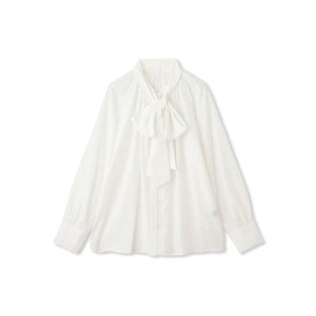 おおぶりな甘さを付与するボウタイブラウスは、ハリ感のあるテキスタイルだからこそ、1枚でも、ジャケットやベストレイヤードでも存在感を発揮します。