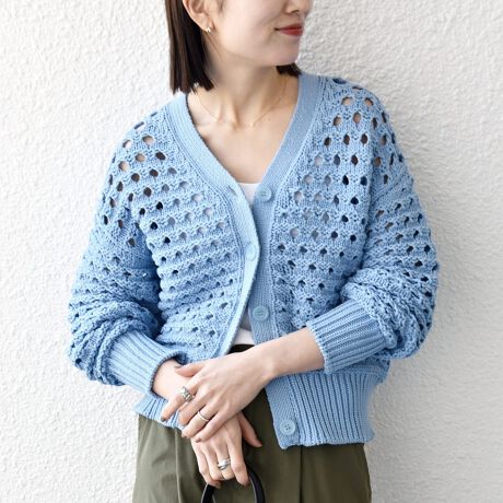 ざっくりとした透かし編みが、大人の抜け感を演出するVネックカーディガン。