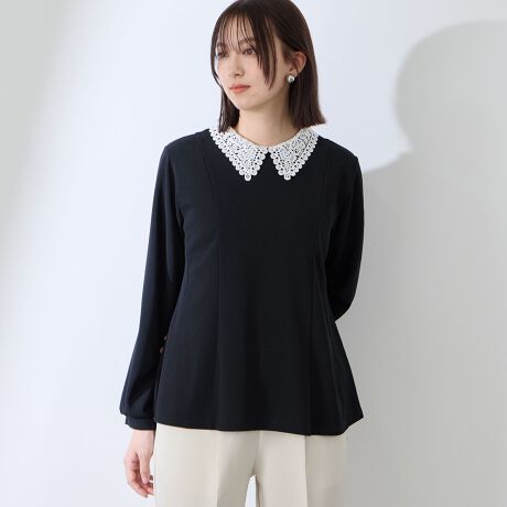 前身頃に切替えの入った、程よくフレアラインを描くシルエットで、リッチ感のある繊細なレース襟が品行方正な甘さをプラスします。