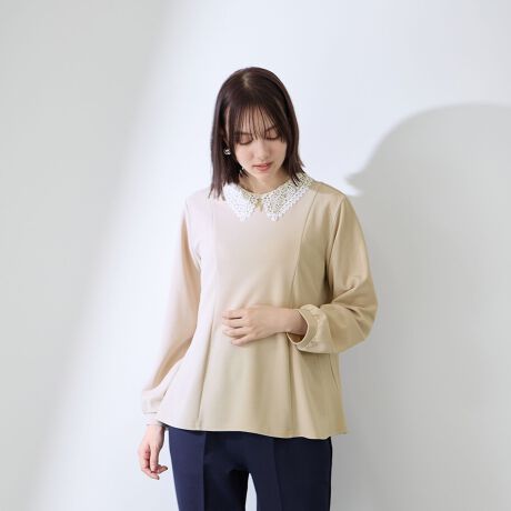 前身頃に切替えの入った、程よくフレアラインを描くシルエットで、リッチ感のある繊細なレース襟が品行方正な甘さをプラスします。