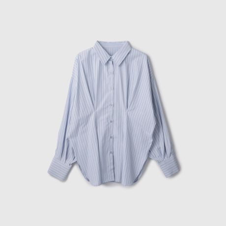 ウエストのタックデザインが、立体感を生み出し、メリハリのあるシルエットでスタイルアップを叶えるストライプシャツ。