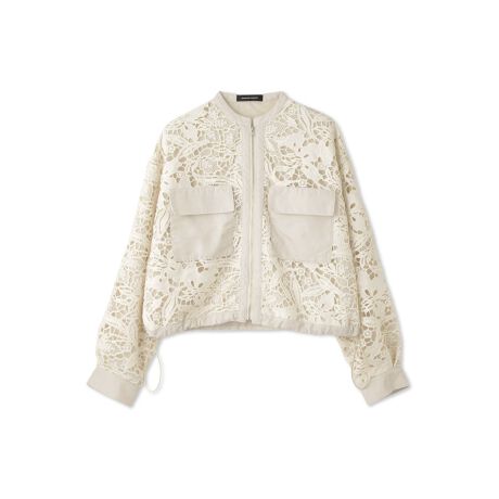 ナチュラルな質感のボタニカルレースが浮かび上がってみえるノーカラーデザインのZIPブルゾンは、合繊素材特有の光沢があるテキスタイルで切り替えたフラップポケットデザインがポイントです。