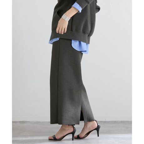 なめらかな表面感でジャージー素材ながらもカジュアルになりすぎず、すっきりとした縦ラインが大人のスタイリングに品よく馴染みます。