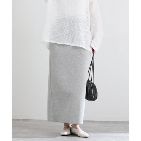なめらかな表面感でジャージー素材ながらもカジュアルになりすぎず、すっきりとした縦ラインが大人のスタイリングに品よく馴染みます。