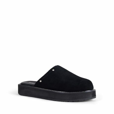 丸みのある柔らかなフォルムが印象的なスライドタイプのモックサンダル。