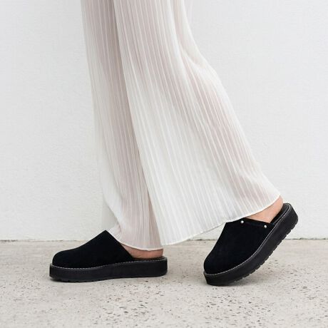 ブラックは厚底のシルエットが際立ち、よりモードでマニッシュな印象に。セットアップスタイルやハーフパンツスタイルにも。