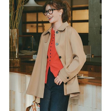 ■デザインAラインシルエットのスプリングアウター。裾に向かってふんわりと広がるテントシルエットが、体のラインをさりげなくカバーし、女性らしい動きを演出します。ヒップが隠れるミドル丈で、バランスの取りやすいシルエットに。大き目のステンカラーがポイントで、チンストラップを留めるとスタンドカラーとしてもご着用いただけます。気温や気分に合わせて、表情を変えられるのも嬉しいポイント。カジュアルにもきれい目にも使いやすく、春のライトアウターとして長く活躍するアイテムです。