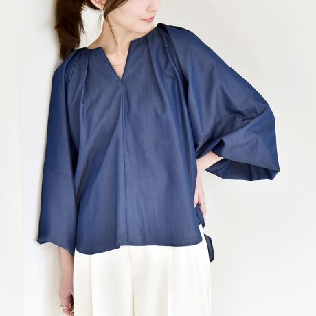 首元は程よいVカットで、首や顔周りをすっきりと華奢見えさせてくれます。