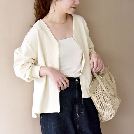 伸縮性があり着心地の良いジャージー素材のジップカーディガン。