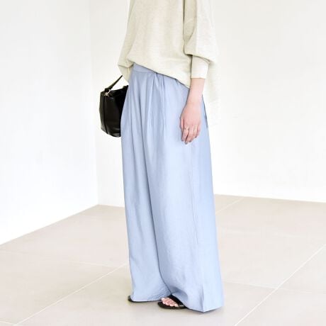 軽い素材でラフさはありながらもとろみがあって綺麗見えするので、ヒールやサンダルなど華奢な足元とも好相性。