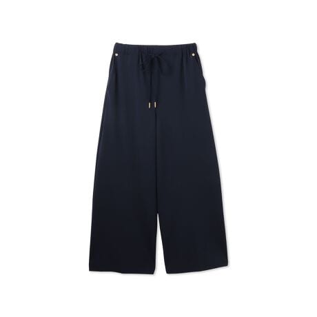 ウエストがぐるりゴム仕様のプルオンタイプで、脚周りはゆとりを持たせたワイドシルエットのイージーデザインです。