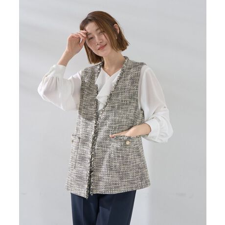 上品なツイード素材が、落ち着きのある大人の女性を演出するジレ。