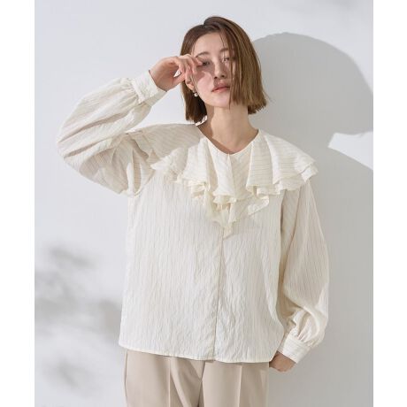 シャープな印象のストライプ柄に、柔らかなラッフルを組み合わせたデザインブラウス。