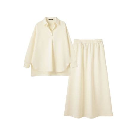 抜け感、ゆとりのあるリラクシーなスキッパーシャツとミニマルなセミフレアシルエットスカートの2ピースアイテムです。