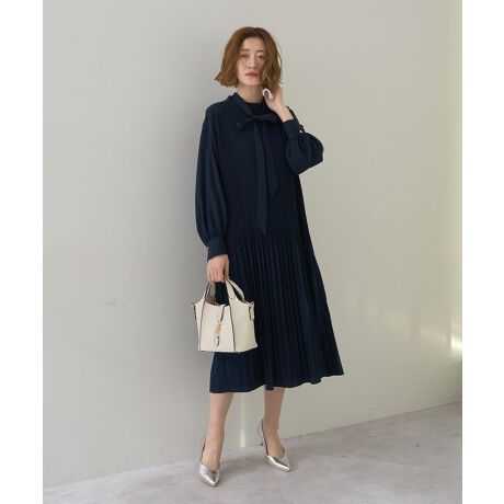 縦に流れるプリーツが美しいラインを描くワンピース。