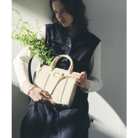 フロントのベルトモチーフがフェミニンなきれいめバッグ。