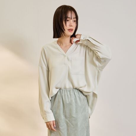 首回りに抜け感をもたらすキーネックデザイン、前後差のある丸みを帯びたヘムライン、ゆとりのあるフォルム、でセンシャルな雰囲気も纏えて、大人の余裕と優しさを感じさせる一枚です。