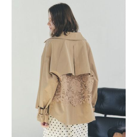 バックレースがアクセントになったショート丈のトレンチコート。