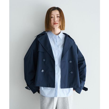 袖ベルトやダブル釦のディテールがトレンチらしい雰囲気を残しつつ、短い丈感で今っぽいスタイリングに。