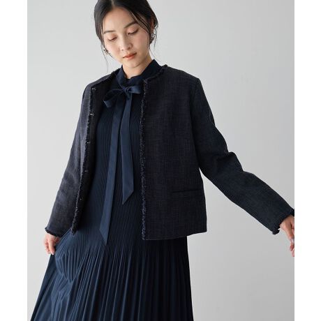 表情豊かなツイード素材が、装いに奥行きと品格を与えるノーカラージャケット。