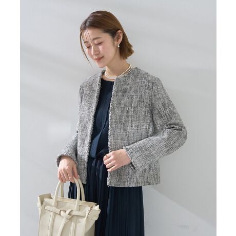 表情豊かなツイード素材が、装いに奥行きと品格を与えるノーカラージャケット。