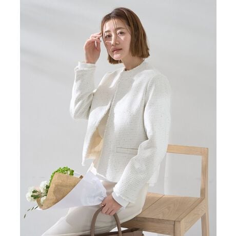 繊細な表情を持つツイード素材が、装いに上品さと華やかさを添えるジャケット。