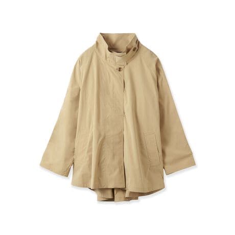 テントラインを描いて、構築的なフォルムがモダンで印象的なコートは、水をはじく撥水加工と花粉汚れ対策機能を付与したテキスタイルを使用しています。
