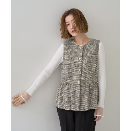 表情豊かなツイード素材に、ペプラムシルエットを組み合わせたジレ。