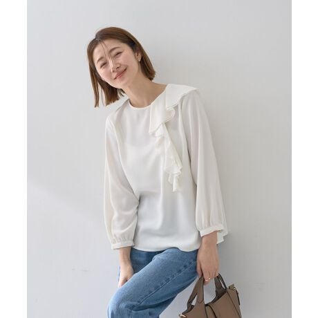 アシンメトリーにあしらったラッフルが、さりげなく個性を引き立てるブラウス。