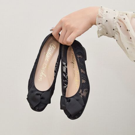 大きめのグログランリボンが大人かわいいフラットパンプス。繊細なレース生地は日本材を使用し上品な雰囲気に仕上げました。透け感のあるチュールを裏材に使用し柔らかく足を包み込み、長時間のおでかけにもぴったりです。