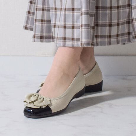 フワっと形作ったラメリボンがアクセントのウェッジヒールウォーキングパンプス。キチンとし過ぎていないちょっとラフなリボンは甘すぎず、カジュアルなコーデにも似合います。足を優しく包んでくれるマシュマロフィットな履き心地のオリジナルのモールドソールは足にフィットするような快適な作りと、つま先に消臭機能もついている万能ウォーキングパンプスです。