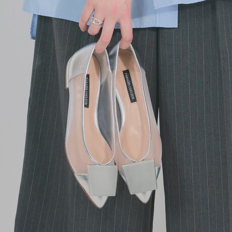 アクリルオーナメントが特徴的なポインテッドトウパンプスは、チュールの透け感が涼しげでフェミニンな印象です。