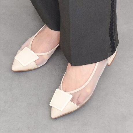 アクリルオーナメントが特徴的なポインテッドトウパンプスは、チュールの透け感が涼しげでフェミニンな印象です。