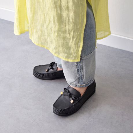 リボンモチーフがさりげなくフェミニンな印象のレザーモカシンは、アッパーが袋状に縫われていて返りが良く、フットベッド仕様で足当たりも良いです。