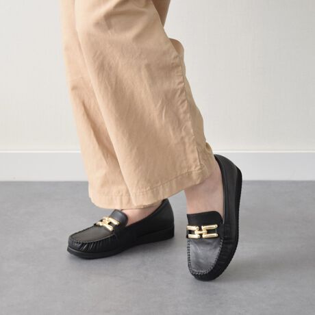 存在感のあるメタルビットがマニッシュかつトラッドな雰囲気のレザーモカシンは、アッパーが袋状に縫われていて返りが良く、フットベッド仕様で足当たりも良いです。