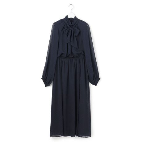 柔らかく透け感のある素材と流れるようなシルエットが魅力のドレス。襟元のボウタイリボンがポイントです。後ろでリボン結びにしたり、前にまわして結んだりと、お好みで着こなしに変化をつけてお楽しみいただけます。袖口にはシャーリングを入れ、後ろにボリュームをもたせて華やかな雰囲気をプラスしたデザインです。カラーは優美な雰囲気を演出するローズ(#011)に、清楚な気品を感じさせるネイビー(#075)の2色展開です。