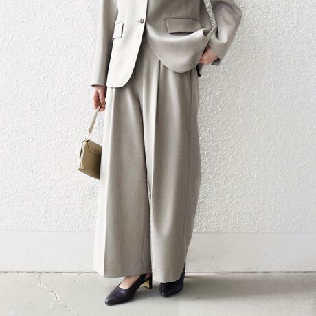 フロントのタックと折山ラインが縦のラインを強調し、ワイドながらもすっきりとした印象に。