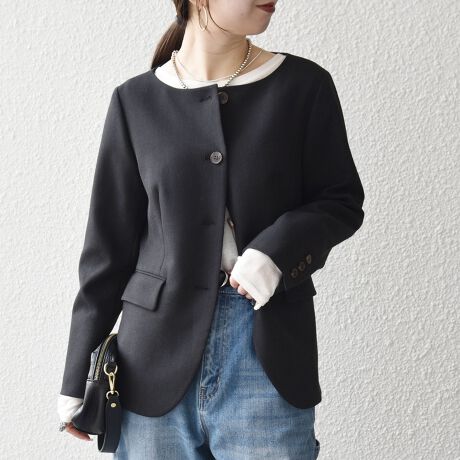 首元がすっきり見えるノーカラーと、ミニマルなシルエットで上品な印象に。