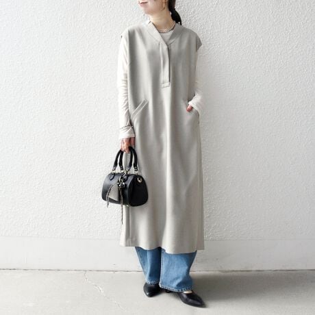 Vネックが顔まわりをすっきりと見せ、落ち感のあるIラインシルエットで体型カバーも◎