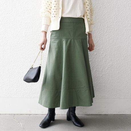 切り替えデザインとたっぷりのフレアがポイントのチノスカート。