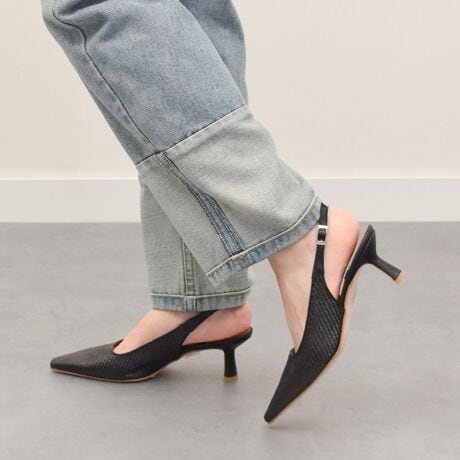 アッパーに雑材を使用したポインテッドトウバックバンドパンプスは綺麗目カジュアルやリゾートスタイルにマッチするアイテムです。