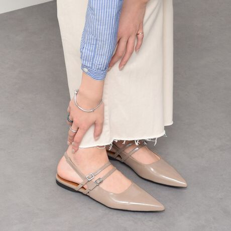 ダブルストラップが特徴的なポインテッドトウのバックバンドパンプスはシンプルなデザインで様々なスタイリングにマッチする一足です。
