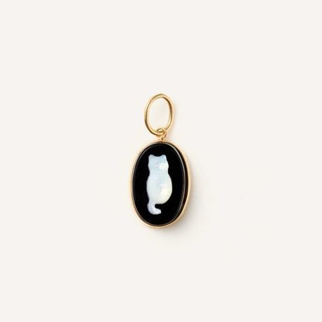 ねこ好きさんのハートをくすぐるねこのシルエットはシェルでふっくらとした丸みを彫刻し、ブラックカルセドニーに貼り合わせました。