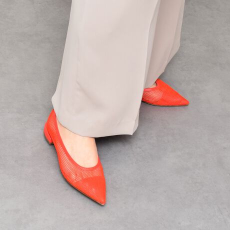 ポインテッドトウがスタイリッシュなローヒールパンプスはネットの素材感が涼しげな一足。