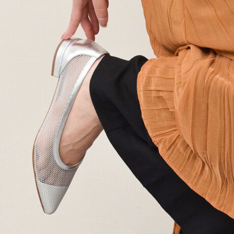 ポインテッドトウがスタイリッシュなローヒールパンプスはネットの素材感が涼しげな一足。
