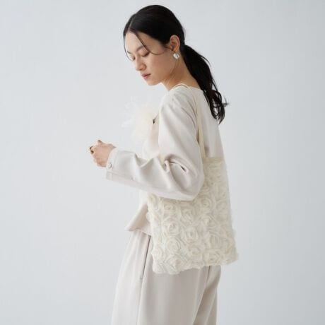 ・立体的なフラワーモチーフが目を惹く、華やかさのあるトートバッグ。