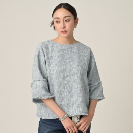 袖口と裾に施されたフリンジが、女性らしさを引き立てるツイード素材のブラウス。