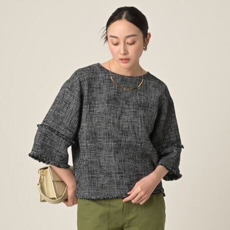 袖口と裾に施されたフリンジが、女性らしさを引き立てるツイード素材のブラウス。
