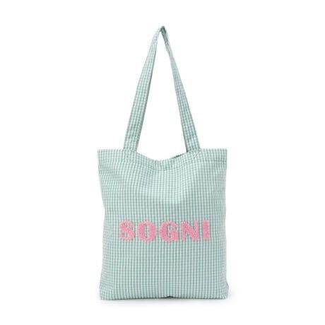 ギンガムチェック柄にカラー口ゴ刺繍が映える、ポップなトートバッグです!